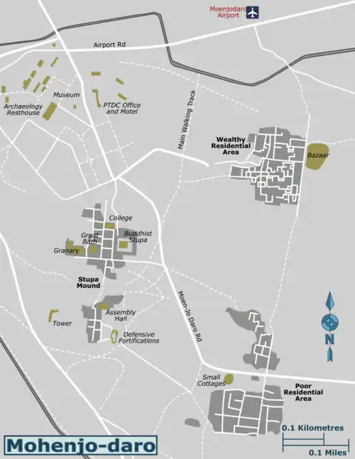 The lower settlement is further divided into two areas: the wealthy residential area to the north had the mansions of the wealthy while the poor residential area to the south had much smaller structures, believed to be inhabited by the common people. It has a variety of structures β residences, workshops, and public facilities such as stupas, baths, wells and a guardhouse.