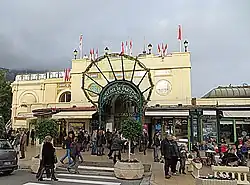 - 🌍 Monaco-Monte-Carlo railway station (Gare de Monaco-Monte-Carlo), Place Sainte Dévote. The principality's only railway station and operated by the French railway company SNCF. It is about 300 m back from Port Hercule, the layout is somewhat confusing as the station has been built underground with an adjacent huge parking garage - the main entrance is by elevator from "above". There are ticket vending machines and few food outlets, including a Starbucks.