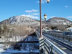 The limit of Mont-Saint-Hilaire stops at the foot of Mont Saint-Hilaire (east side); thus the distance between the Richelieu River (at the height of the bridge) and the eastern limit of the municipality is 5.7 km (3.5 mi).