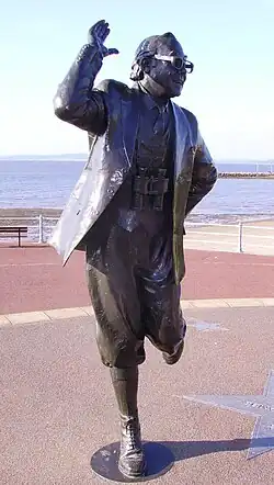 • Morecambe promenade stretches five miles from Heysham to the south, passing Sandylands, the Battery and West End, the Midland Grand Hotel, the Stone Jetty (a former ship-breaking yard), the 🌍 Eric Morecambe statue, Clock Tower, and Lifeboat Station to Happy Mount Park in the north-east. The promenade is flat, and easy going for bikes, wheelchairs and prams. The town's most famous son John Eric Bartholomew (1926-1984) is depicted in characteristic skip-dance; he formed a comedy duo with Ernest Wiseman in 1940. They were going to name their act for their home towns but "Morecambe & Leeds" sounded like a cheap train excursion so "Morecambe & Wise" they became.