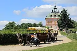 - 🌍 Fasanenschlösschen ("pheasant house"). Rococo-style maison de plaisance. 2 km exactly east of the castle with whom it forms a visual axis.