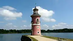 - 🌍 Lighthouse (Leuchtturm) (near Fasanenschlösschen). 350 km off the nearest seashore, it never had a nautical function, but is a "folly" built as part of a scenery for the reenactment of naval battles.