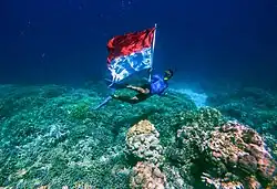 A freediver hold an Indonesian flag in the water of Dodola Island.