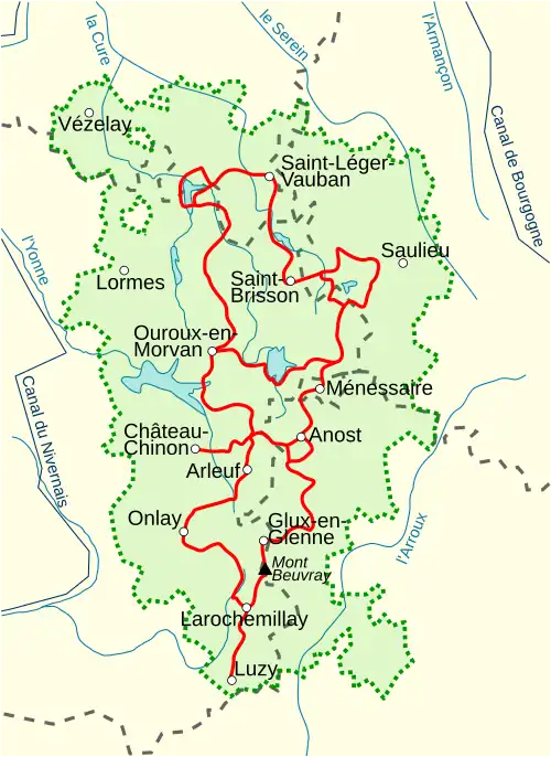 - The GR13 - The park is bisected from north to south by the French trail GR13 (Sentier de Grande Randonnee 13), which is part of the European trail E5. The GR13 runs from Fontainebleau near Paris to Bourbon-Lancy in Burgundy. Slightly northeast of Vézelay it reaches the Morvan and the route runs through Saint-Père to Glux-en-Glenne. Hence the Mont Beuvray (821 m) to the south and exits the park east of Luzy. The total length of the GR13 in the park is about 140 km. The route is marked white-red.