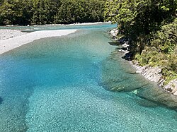 - π Gates of Haast, Haast Pass Hwy (OpenStreetMap directions). Although the Gates of Haast specifically refers to a gorge at the southern crossing where SH6 crosses the Haast River, it's known for its bridge put together with its idyllic background (no parking available).