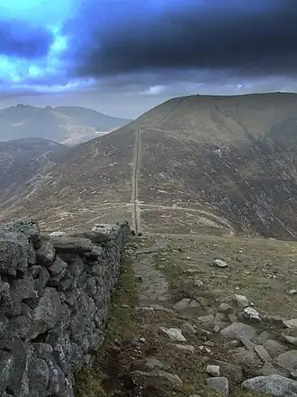 - π Slieve Donard is Northern Ireland's highest mountain at 850 m / 2790 ft, so it ranks as a Marilyn. It's climbed by a straightforward but muddy and eroded path from Newcastle. Park at Donard Forest and ascend through mixed woodland along Glen River. The riverbank becomes steep, almost overhanging, so there's a bit of a scramble; you criss-cross the river but there are footbridges. You emerge onto heathland and reach the saddle or col, where you fetch up against Mourne Wall. Turn left (southeast) and follow the wall up past a couple of false summits to the top. There are two prehistoric burial cairns at the summit, but they're in poor shape, just a jumble of stones. The route is 3 miles each way, reckon 4 hours there and back.