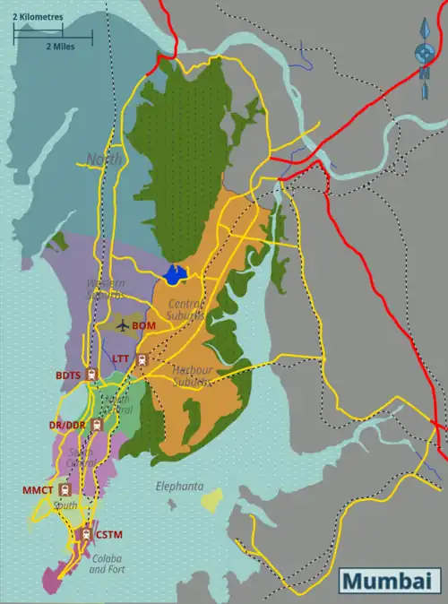 | Western Suburbs (Bandra, Khar, Santacruz, Juhu, Vile Parle, Andheri) Home to those who want to have a more peaceful surrounding. It has a few beaches and promenades. Home to a large Christian community and the city's most famous church. This is also where the city's main airport is. |