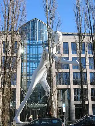 - 🌍 Walking Man (U-Bahn U3, U6: Giselastraße) is the 17 m white statue at 36 Leopoldstraße. It was constructed by Jonathan Borofsky in 1995 in Sun Valley California, then brought over in nine pieces for assembly - there's a stairway within that was used for that purpose, but it is not open to the public. The statue is meant to indicate progress in a busy modern world. He's striding out of Munich Re (also designed by Borofsky) whose main business is re-insurance, laying off the risks shouldered by primary insurers, so he's probably hurrying to investigate a claim. Look down Leopoldstraße for a vista of Siegestor, the victory arch described in Maxvorstadt.