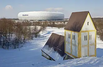 - 🌍 Fröttmaning Hill (U-Bahn U6: Fröttmaning) is a 75 m high mound covering the lost village of Fröttmaning, which dates to the 6th century, with its church consecrated in 815 AD. In the 1950s as Munich expanded the area was demolished and turned into a waste dump. Methane from decaying garbage caused fires, so the hill resembled a volcano swathed in smoke and stench. The dump was closed in the 1980s and the hill re-natured, with vents for off-gassing and retaining walls against seepage. It's now a pleasant park topped by a wind turbine and with views of the Alps on a clear day. It's popular for mountain biking and tobogganing - the idea for a ski slope and chairlift has come to nothing. Heilig-Kreuz-Kirche (Holy Cross Chapel) at the north foot of the hill is 13th century, the last survivor of the village. It's often been threatened by demolition, vandalism or engulfing in trash, but it was found to have Romanesque ceiling frescoes from the 1740s. (It's active Roman Catholic but seldom open, you may be able to peek in around services.) 150 m south is an apparently identical chapel half-buried in the hillside, as if by a fetid avalanche: this is an artwork created in 2006 as part of the Allianz Arena construction.