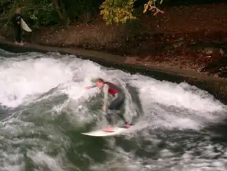 - 🌍 Surfing on the Eisbach, Prinzregentenstraße (Tram 18: Nationalmuseum / Haus der Kunst). The Eisbach is an artificial side-channel of the Isar, culverted beneath Altstadt but emerging at the bridge on Prinzregentenstraße, south edge of English Garden. Here it drops over a 1 m weir to form a standing wave, surfable whenever there's a good flow of water. Late winter into early summer is best, as its parent river cascades down from Alpine snows and the "ice stream" earns its name. Surfers queue up on the banks - there's only room for one at a time, and as it's a standing wave you can surf as long as you can stay upright. After half a minute it's etiquette to attempt a move beyond your skill level, wipe out and be borne by the current to the back of the queue. It's considered an expert surf, and beginners should hone their skills 500 m northeast downstream at Dianabadschwelle, where the wider stream makes for a gentler wave shared with kayakers. They might also try the Floßlände wave in Obersending south side of Munich. The main Isar is occasionally surfable at Wittelsbacherbrücke just south of Altstadt, but only in spate with all sorts of unpleasant or hazardous stuff racing down the brown torrent.