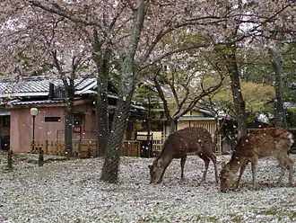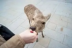 The deer in Nara Park tend to be friendly and perhaps overly eager to eat shika-senbei biscuits from the hands of tourists - simply possessing some will inevitably attract a small crowd of five or six deer, whose extreme and single-minded interest in these biscuits and accompanying lack of respect for your personal space may well be a bit startling when experienced en masse. Don't be fooled by the publicity shots of the deer being happily petted: they can sometimes be aggressive in pursuit of those who have food while thoroughly uninterested in anyone who doesn't have any. Small children in particular may be frightened to have the suddenly manic deer coming after them, so it may be best to feed the deer yourself and let the kids watch. While in the Kasuga-yama forest, steer clear of any deer which still have their antlers. They can be aggressive and their antlers can injure you.