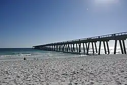 Navarre Beach, with its distinctive emerald green water, earning it the nickname of the Emerald Coast. This is the narrow strip of land in the sea across the causeway. Navarre's enormous stretch of beach is spectacular, with some of the most beautiful white sand beaches in the world. See the 'Do' section and 'Beaches' sub-section for the most prominent beach access points.