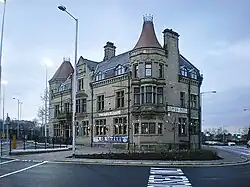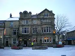 - 🌍 Station Hotel ('station' or 'spoons' because it used to be one of the "Wetherspoons" chain years ago), Hibson Rd BB9 9SB (Hibson Road junction with Broadway). Grade II listed building dated 1893, with minor late 20th century alterations and with carved lettering: "STATION HOTEL" in the ashlar dressing. Much original interior detailing survives, including wall panelling, door joinery and finely-detailed surrounds, ornamental plasterwork, hearths and hearth surrounds, together with screens to all the principal bar areas. This consciously-detailed railway hotel was built at the height of Nelson's rapid industrial development and deliberately designed to impress those arriving in Nelson by rail. Probably the biggest public house in the neighbourhood and now a Freehouse.