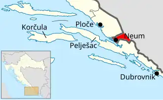 Neum is a resort town on the 9 km strip of Adriatic coast that belongs to Bosnia and Herzegovina. In other contexts this country is often loosely referred to as "Bosnia", but Neum is specifically part of Herzegovina. That entity is undefined and contentious so on this page the country is abbreviated to BiH. In 2013 the Neum strip had a population of 4653, most of them in the town itself.