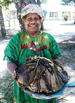 - Bougna, a traditional meal among the native Melanesians, which consists of some form of meat, pork, chicken, fruit bat, crab, etc, along with roots such as yams and sweet potatoes. This is wrapped in banana leaves and cooked under hot rocks heated in a fire.