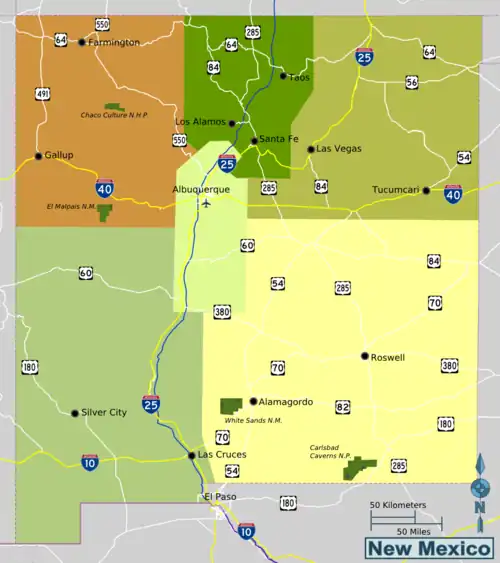 - 🌍 Albuquerque – By far the state's largest city and the center of commerce for the state, with a fair number of tourist attractions in its own right, including a massive and spectacular hot-air balloon fiesta.