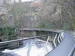 - ๐ Stroll through Torrs Riverside Park (various routes, widely signposted). One possible route is to descend from Torr Top car park (just off Market Street), passing Torr Top Cottages, a listed range of weaver's cottages , walk downstream along the River Sett to its confluence with the River Goyt (site of the Torrs Hydro reverse Archimedes screw). Take the right-hand fork to cross the Millennium Walkway and view the Grade II* listed Torr Vale Mill before returning to the town centre via Station Road. Total distance approx. 1 mile, with one steep descent and ascent but otherwise level. Free leaflets describing this and other walking routes around the town is available from News Mills Heritage and Information Centre (see "Connect"). Free.
