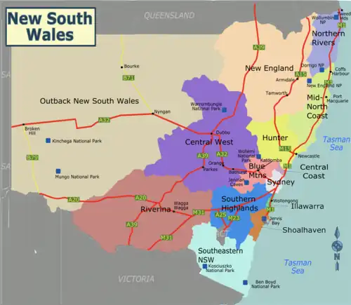 | Central West The rolling flat plains to the west of the Great Dividing Range. Home to the towns of Bathurst and Dubbo and the wine region of Mudgee |