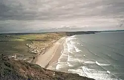 Newgale (Welsh: Niwgwl) is a village with a three mile stretch of beach in the parish of Roch, Pembrokeshire. The beach is situated in the Pembrokeshire Coast National Park and on the Pembrokeshire Coast Path and has rugged coastal scenery with the path winding up and down the cliffs.
