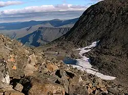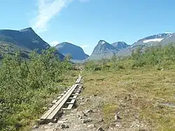 The Kungsleden trail from Abisko passes by the western edge of the Kebnekaise massif along the Tjäktjavagge (Čeakčavággi) valley.