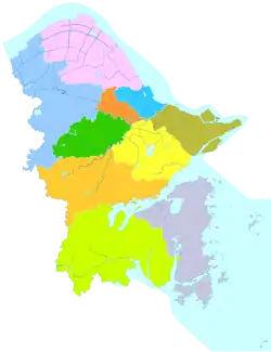 Outer districts include Cixi 慈溪, Yuyao 余姚, Zhenhai 镇海区, Beilun 北仑区, Fenghua 奉化区, Ninghai 宁海县 and Xiangshan 象山.