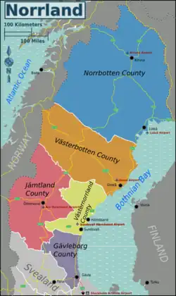 | Västerbotten County (Provinces: Västerbotten and southern Lappland) Contains Umeå, Norrland's largest city, as well as tall mountains at the Norwegian border. |