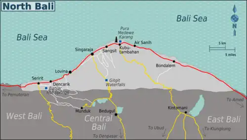 From the south. The main road through the highlands comes down the northern face of the central mountain range and continues into Singaraja. This is a picturesque drive. Driving time from Bedugul in Central Bali about 1 hour, from Ubud about 2 hours and from the main tourist destinations in South Bali, about 3 hours.