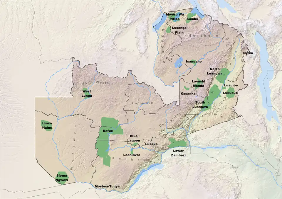 Like the South Park, its eastern boundary is the Luangwa River, while it rises to cover a stretch of the Muchinga Escarpment to the west. The Mwaleshi River flows east–west through the centre of the park, the area to its south being a strict wilderness zone.