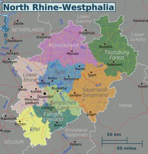 North Rhine-Westphalia (German: Nordrhein-Westfalen) is the most populous state in Germany, with 17.5 million inhabitants, located in the west of the country. It consists of two historically independent parts: Nordrhein, the urbanized area across the river Rhine in the southwest, and Westfalen in the northeast, which is quite diverse as it includes both the heavily industrialized and densely populated Ruhr Valley and the very green Teutoburg Forest.