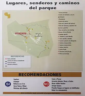 - 🌍 Cerro Corá National Park (45 km before Pedro Juan Caballero on Ruta 5. Any bus on the Asunción/Concepción-Pedro Juan Cabellero route can drop you at the junction, from where it is 1 km walk to the park office. Bus from Concepción: 4 hr, GS.30,000.). daily 07:00-17:00, but camping inside is possible. Light trekking (8-13 km), caves with petroglyphs, beautiful landscape and viewpoints in the midst of hills popping out in the lush green nature, and the occasional jaguar. Also, there an impressive and depressing war monument, for which most people come here. However, checkout the trails and camp sites on OpenStreetMap. Free.