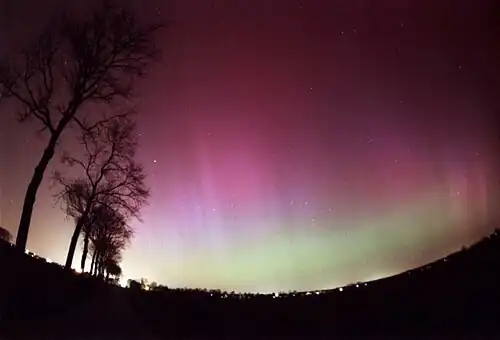 In addition to these more or less regular variations in frequency of the aurora, there are also less predictable, erratic displays resulting from solar storms. Some of these, particularly near solar-activity maximum, can lead to visible Northern Lights remarkably far south, if you're in an area with clear, transparent night skies. The largest recorded solar storm took place in 1859; the Lights were bright enough to read a newspaper in Boston (42°N) and visible as far south as Mexico. That storm was powerful enough that telegraphs would work without their normal power source, some caught fire. A similar one would probably destroy most electronics.