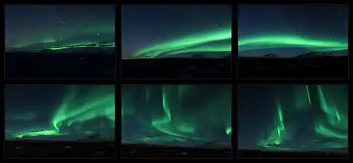 The time between 6PM and 1AM is the most intense period of the day. The highest probability within this timespan is between 10 and 11PM. However, this is a guideline, and during the Polar night aurorae can be observed as early as 4PM, and all through the night. The most intense displays last some 5–15 minutes each. In periods of strong activity, one can generally expect flares starting in the early evening, peaking around 10pm, and going on into the early morning hours.