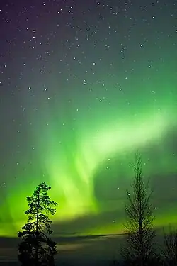 The Lights look somewhat similar to a sunset in the sky at night, but appear occasionally in arcs or spirals usually following the earth's magnetic field. They fairly often look like moving curtains of light, high in the sky. They are most often light green in color but often have a hint of pink. Strong eruptions also have violet and white colors. Red northern lights are rare, but are sometimes observed.