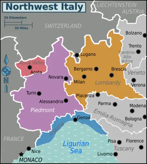 North-western Italy, also known more simply as North-West, is that part of the Italian territory that includes the regions of Liguria, Lombardy, Piedmont and Valle d'Aosta.