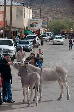 A group of wild burros visits daily to munch on carrots that local shopkeepers are all too happy to sell. They have become obese from the practice and the U.S. Bureau of Land Management has requested shop managers stop selling carrots. Some are selling alfalfa cubes to offer the burros instead. Feeding baby burros is discouraged, and some may sport a "Do Not Feed" sticker on their foreheads, provided by the BLM. Feeding wild burros on the road outside the town of Oatman is not legal and causes a road hazard. Pull well off to the side of the road to watch them.