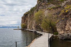 - 🌍 Bay of Bones Museum (Museum on Water; Музеј на вода „Залив на Коските“), between Peštani and Trpejca. In a small bay near the Gradište campground and beach, a Neolithic settlement has been reconstructed atop the water along with fortifications and a museum on land. The floating town contains reconstructed prehistoric homes with various objects inside them to help illustrate what life was like at this spot many years ago. Archaeological evidence suggests Lake Ohrid was once rich in these pile-dwelling settlements. Since opening in 2008, it has become one of Ohrid's most popular attractions. The site also features a scuba diving centre. The museum is easily accessed off the highway leading to Saint Naum and boats from Ohrid's port also make stops here.