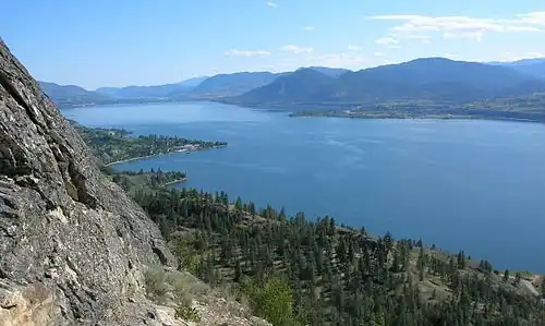 The Okanagan (often referred to as the Okanagan Valley) is a region of British Columbia. It borders the Shuswap region to the north, West Kootenays region to the east, Similkameen region to the west, and the American border to the south. The focus of this region is the 135-km-long Okanagan Lake which runs north-south from Vernon to Penticton. The region is bordered on both the east and west by mountains. The valley is known for its hot, dry summers and is a favourite vacation spot for sun seekers and outdoor enthusiasts. It is also famous for its fruit orchards and wineries.