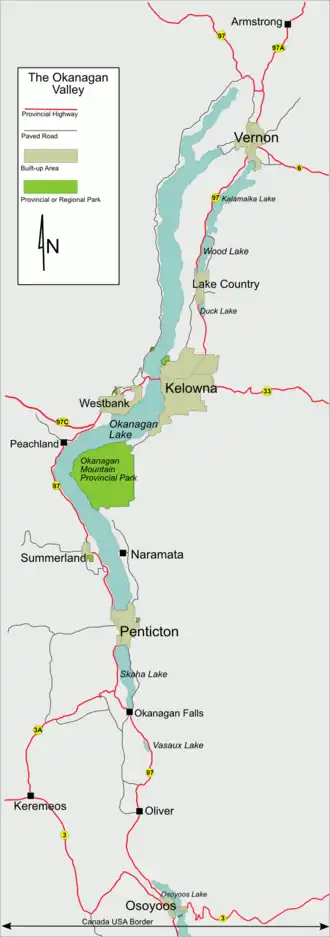 Geographically, the region runs predominantly north-south following the course of Okanagan Lake, and is framed by mid-level mountains on the east and west sides. Highway 97, which navigates the region, follows a different valley several kilometers to the east of Okanagan Lake north of Kelowna. While the big lake is the most renowned, there are several other notable lakes in the valley including Kalamalka, Wood, Skaha, Vaseaux, Tuc-El-Nuit, and Osoyoos Lake.