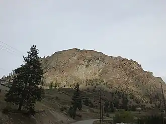 - π McIntyre Bluff (Indian Head or nΚaylintn) (southwest of Okanagan Falls). The ragged cliffs of Indian Head, one of the most unusual rock formations in the Okanagan. Consisting of dark volcanic rocks overlying a lighter conglomerate. This formation contains spectacular megabreccia, volcanic and plutonic rocks up to 70 m (230 ft) across and metamorphic rocks of up to 500 m (1,600 ft) across.