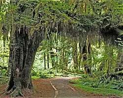 Temperate rain forests form in mid-latitude regions receiving over 55 inches (140 cm) of precipitation. The nearby Pacific Ocean dumps up to 15 ft (4.6 m) of rain per year in the valleys on the west side of the park. Enormous Sitka spruce and Douglas fir tower hundreds of feet high, as thick, furry epiphyte moss and dense, vibrant vegetation create a beautiful, almost "Tolkien-esqe" environment.