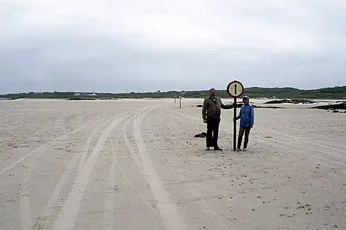 The strand from Claddaghduff to Omey Island is passable for about 3 hours either side of low water. Look this up on a tide predictor such as Easytide, using Clifden Bay as the base port. If you're hiking, be ready to start crossing soon after the water drops, since you want several hours to get around, and it's pointless coming to Omey if you have to keep glancing at your watch. With a vehicle, maybe leave it an hour to dry out and minimise the salt spray into the chassis. You don't need 4WD, but do stick to the marked route across.