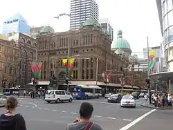 If you've finished with Pitt Street Mall, walk to the other end of the Mall (Market Street) cross Market Street and turn right until you come to the major intersection with George Street. On your way, pop into the State Theatre and admire the beautiful art deco foyer. The State Theatre puts on a number of musicals and other theatrical performances throughout the year. Across George Street you will see the Queen Victoria Building (QVB). The original site of one of Sydney's markets, the building was almost demolished in the 1970s and replaced by a carpark. Thankfully, public reaction to that plan saw the building preserved and transformed into one of Sydney's boutique shopping centres with many of the major fashion brands having a store inside. There are also some nice cafes inside. Make sure you check out the large dome in the centre of the building.