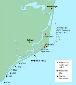 Orford is a small coastal town within the Suffolk Coast and Heaths AONB (Area of Outstanding Natural Beauty). The town is separated from the sea by a 10-mile-long shingle spit known as Orford Ness, the town being mid-way along the spit. The spit is connected to the mainland ay Aldeburgh and the River Alde flows along the coastline between the mainland and the shingle spit. The town is the only means of access to the Orford Ness nature reserve.