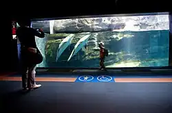 - 🌍 Osaka Aquarium Kaiyukan (海遊館), 1-1-10 Kaigan-dori Minato-ku (5 minutes walk from Osakako (Osaka Port) station on Osaka municipal subway Chuo Line or Techno Port Line), ☏ +81 6-6576-5501, info-e@kaiyukan.com. 10:00-20:00 (last admission is 19:00). This is one of the world's largest aquariums, with 11,000 tons of water and plenty of sharks (including a whale shark), dolphins, otters, seals, and other sea creatures. The largest tank, representing the Pacific Ocean with 5,400 tons is nothing but overwhelming. Can get intensely crowded, but the aquarium is a spiral featuring the same tanks, and crowds thin out as you get to deeper views of each tank. Back Stage Viewing is available for an additional fee. ¥2700 adults (16 and over, high school), ¥1400 child (7-15, elementary school and junior high-school), infant (4-6) ¥700.