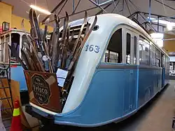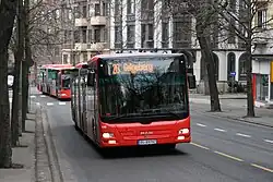 There is a comprehensive public transport system in Oslo, consisting of buses, trams, local trains, metro (T-bane) and boats. The public transport is planned and coordinated by Ruter. The five metro lines have numbers 1 through 5, the six tram lines have numbers 11 through 19, buses have labels from 20, while boats (ferries) are B1, B2 and so forth. Local trains operated by Vy are covered by Ruter ticket system. The local public transport of Oslo also covers the suburbs in Akershus, notably Bærum in the west, where the tram and metro cross the county line.