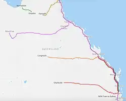 Queensland Rail operates 4 train lines in Outback Queensland. The Westlander runs between Brisbane and Charleville (740km, 17 hours) overnight, twice weekly. There are no sleeping cars on this service. The Spirit of the Outback runs between Brisbane and Longreach (1325km, 26 hours). It departs Brisbane Tuesday and Saturday late afternoons, and departs Longreach Monday and Thursday mornings. This service has seating and first class single and twin sleeping berths. This service follows the coast as far as Rockhampton (although the tilt train travels between Brisbane and Rockhampton much more quickly) before it turns inland. The Inlander runs between Townsville and Mount Isa (977km, 21 hours) twice weekly. It leaves Townsville in the early afternoon on Wednesdays and Saturdays, and departs Mount Isa early afternoon Thursdays and Sundays. There are no sleeping cars on this service. Finally, there is a rail link once per week between Normanton and Croydon, called The Gulflander, but it is likely of little use to tourists.