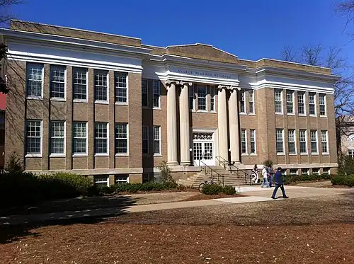 - Ventress Hall, a 19th-century Victorian building on the edge of The Grove. Originally used as a library, now the home of the College of Liberal Arts. Inside is a huge stained glass window depicting a battle scene from The War(unless otherwise specified, "the war" in the deep South means the one taking place between 1861 and 1865). The window was commissioned by the Delta Gamma Sorority from the Tiffany Glass Company to honor the University Greys, a company comprised completely of Ole Miss students that suffered 100 percent casualties at the battle of Gettysburg. The turret contains a winding staircase filled with graffiti over 100 years old. Legend has it that William Faulkner got intoxicated, climbed to the top of the turret, and began shouting "Hotty Toddy" — the school's unofficial cheer. However, this is likely merely a legend, but a darn good one. A member of the staff inside would be happy to give you a brief tour.