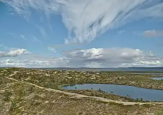 Most of the area is dominated by fell birch forest, bogs and small lakes. In the south there are also pine forests. Diverse fell vegetation is found on many fell tops and in the far north.