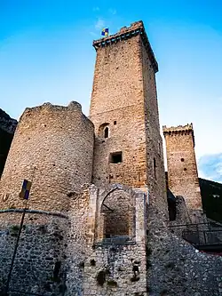 - 🌍 Caldora Castle or Cantelmo Castle (Castello Caldora) (in the historic cent of Pacentro). It was built on a trapezoidal base. In the corners there are square-based towers (only three are visible today) typical of the Abruzzo landscape of the Peligna Valley. For its majesty it is famous among the Abruzzo castles. It overlooks the square with its seventeenth-century façade opposite the church of Santa Maria Maggiore. The construction is prior to the period between the end of the 14th century and the beginning of the 15th century, given that the first renovation was carried out in this period; some date the construction between the 11th and 13th centuries, the period in which the truncated north-east tower should have been built. A reinforcement including some enhancements took place in the second half of the 15th century when the Orsini added circular towers. The construction of the trapezoidal walls can also be ascribed to this period. In the 1960s, the castle was restored again, but the massive use of reinforced concrete caused controversy; subsequently further restorations returned the original appearance of the Peligna fortress.