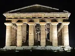 - Three ancient Greek temples. There are three magnificently preserved Greek temples on the Paestum archaeological site, but they have all been erroneously designated in the past. Even the signage on site and maps do not always match the most current attributions. The designations change because of newly excavated evidences of the use of the temples. Perhaps further research would call for changes in the current attributions, but that is a scenario for future travelers. For present day travelers, the Greek temple in the northern part of Paestum is identified as a Temple of Athena, and the two Greek temples in the southern part of Paestum are identified as two temples of Hera. All three temples are oriented east-west, with the front facing the rising sun. The oldest temple is the southern most one, the Temple of Hera I (also erroneously called Basilica), built around 550 BC. The temple is wider than most Greek temples, with nine columns across the front and eighteen along the longer sides (9x18). The next oldest of the three temples is the Temple of Athena (also erroneously called Temple of Ceres), built around 500 BC on the highest point of Paestum, which is north of the ancient center of town. It has six columns across the front and thirteen along the sides (6x13). It is the first known temple in the world to mix the Doric columns of the main peristyle with the Ionic columns used in the porch (see Museum). The third oldest is the best preserved Greek temple in Paestum and perhaps the world -- the Temple of Hera II (also erroneously called Neptune Temple or Poseidon Temple), built around 450 BC. It is just north of the Temple of Hera I, and it has six columns across the front and fourteen along the sides (6x14). It belongs to a transitional phase between the archaic and the classic Doric order and incorporates subtle architectural refinements peculiar to the classic Doric order. For example, the base on which the columns rest is not completely horizontal, but humps up slightly in the middle along the sides to offset the illusion of sagging. The Temple of Hera II in Paestum is modeled closely after the Temple of Zeus in Olympia, foreshadowing the most celebrated classic Greek temple, the Parthenon in Athens.